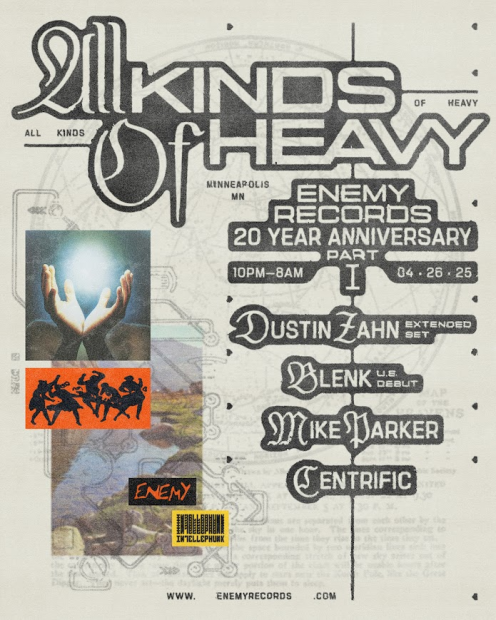 ALL KINDS OF HEAVY Venue TRXX WRHS 3111 California St NE Minneapolis, MN 55418 United States TimeSat, Apr 26 2025, 10pm - Sun, Apr 27 2025, 8am Promoter Enemy Intellephunk Price$45.00 Artists Dustin Zahn Blenk Mike Parker Centrific Genres Techno Age Limit 21+ Ticketsra.co